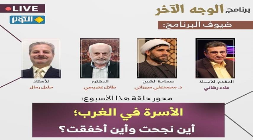 برنامج الوجه الاخر برنامج حواري يبحث المسائل التي تخص المسلمين، وسيبحث البرنامج هذا الاسبوع موضوع "الاسرة فی الغرب أین نجحت و أین أخفقت؟ " وذلك مع اصحاب الراي والمتخصصين في هذا الشأن.