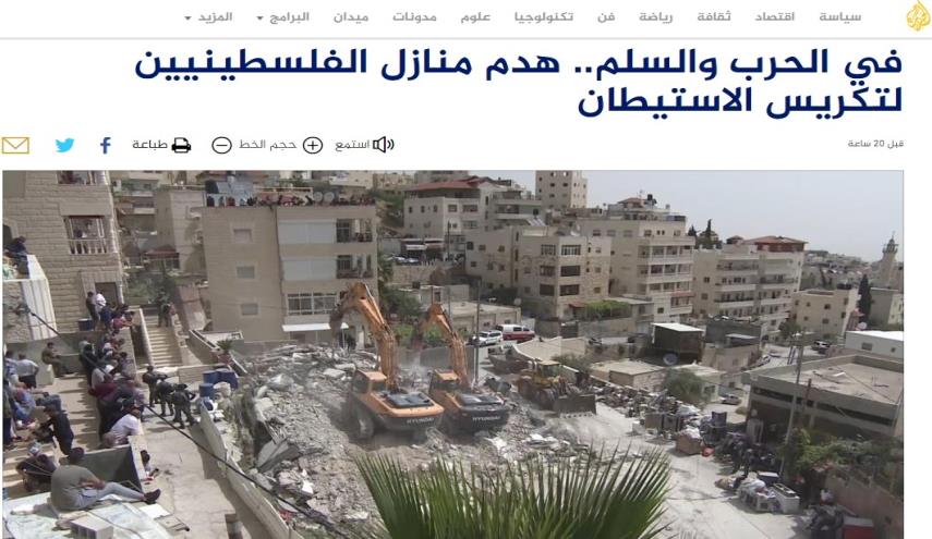 قضية ساخنة _الكوثر: تناول موقع قناة الجزيرة هدم الاحتلال لمنازل الفلسطينيين بالتحليل مشيرا الى إن عمليات الهدم الإسرائيلية تجري في سياق سياسة شاملة تستهدف الوجود الفلسطيني في مناطق الضفة الغربية والقدس خاصة.