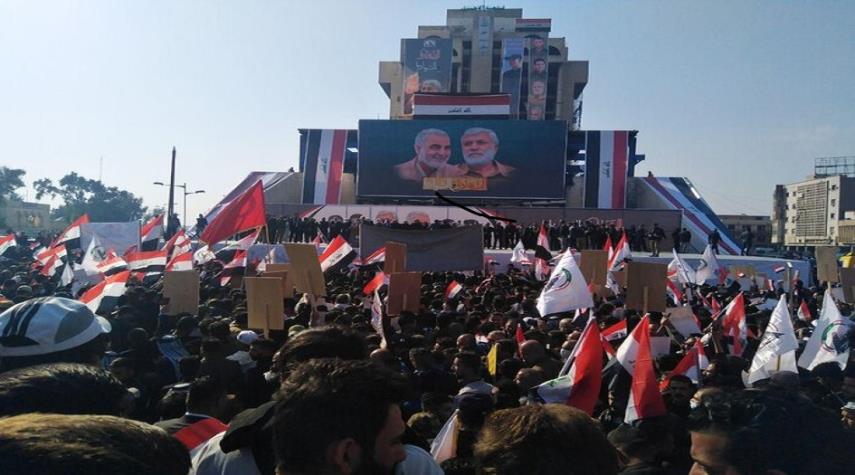 العراق - الكوثر: خرجت مسيرة شعبية في ساحة التحرير وسط العاصمة العراقية بغداد، صباح اليوم الأحد، في ذكرى استشهاد قادة النصر، الشهيد الفريق قاسم سليماني والشهيد ابو مهدي المهندس ورفاقهما في جريمة ارهابية قامت بها طائرة امريكية قرب مطار بغداد الدولي في الثالث من كانون الثاني 2020.
